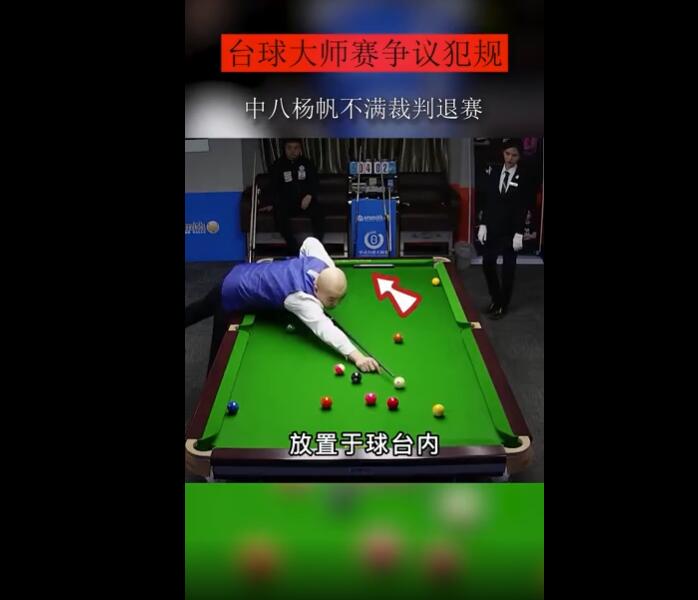 在2021年乔氏中式台球大师赛的过程中,知名四平选手扬帆出现了退赛的一幕。在64进32的双败赛中,扬帆对阵于海涛,扬帆因为对女裁判的判罚产生异议而退赛。当时的情况是这样的:扬帆将后手加长杆放置于台球桌内,待扬帆进球后,裁判才宣布进球无效。对此扬帆表示不满,争议无果之后,宣布退赛,下面是加长杆在卓内的画面。